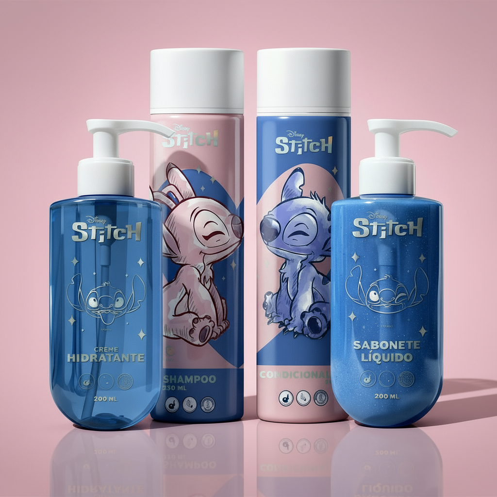 Hidratante Corporal: coloque uma porção nas mãos e espalhe na pele como quem espalha carinho! Massageie com movimentos suaves até sentir a pele macia e cheirosa como um abraço do Stitch. Reaplique sempre que quiser renovar esse cuidado gostoso.