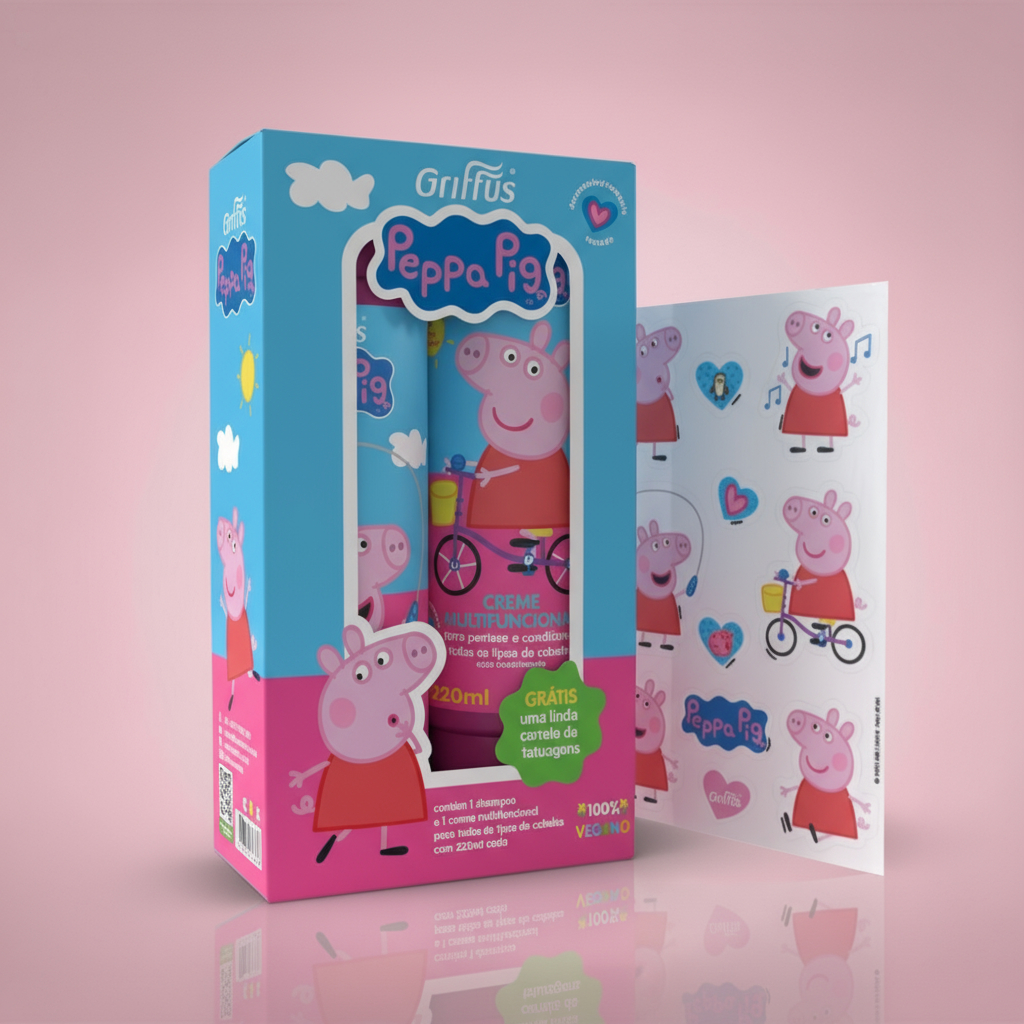 O Kit Shampoo sem Embaraço e Creme Multifuncional Peppa Pig Griffus é a escolha perfeita para cuidar dos cabelos das crianças de forma suave e eficaz.