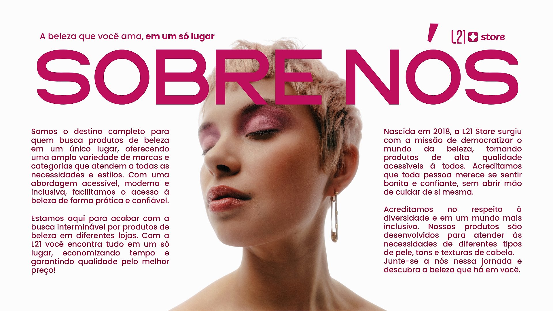 Prazer, somos a L21 Store. Chegamos para democratizar o universo da beleza e bem estar, atendendo aos mais variados tons de pele, gêneros e perfis.